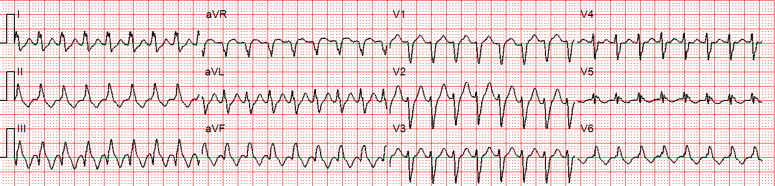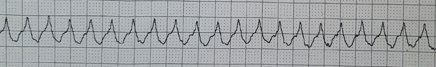 Figure 1: There is a wide and regular complex tachycardia at a rate of ~ 230 bpm.