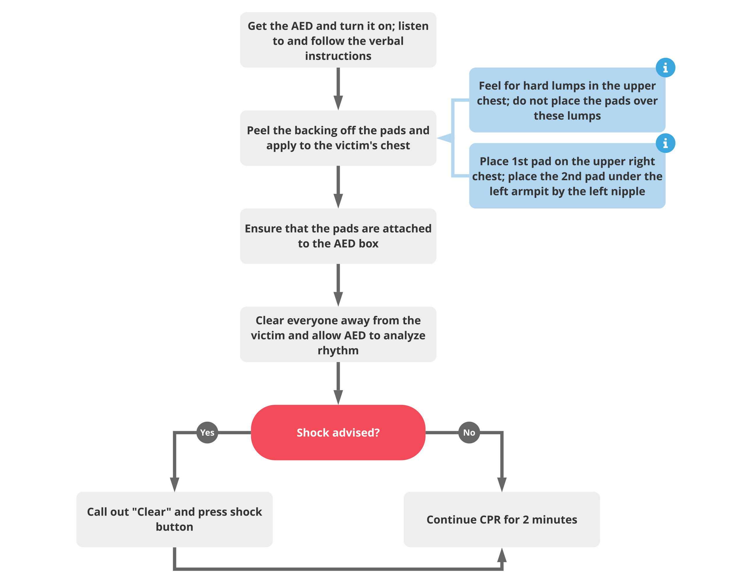 - If the AED does NOT detect a shockable rhythm, it will tell you to resume CPR.