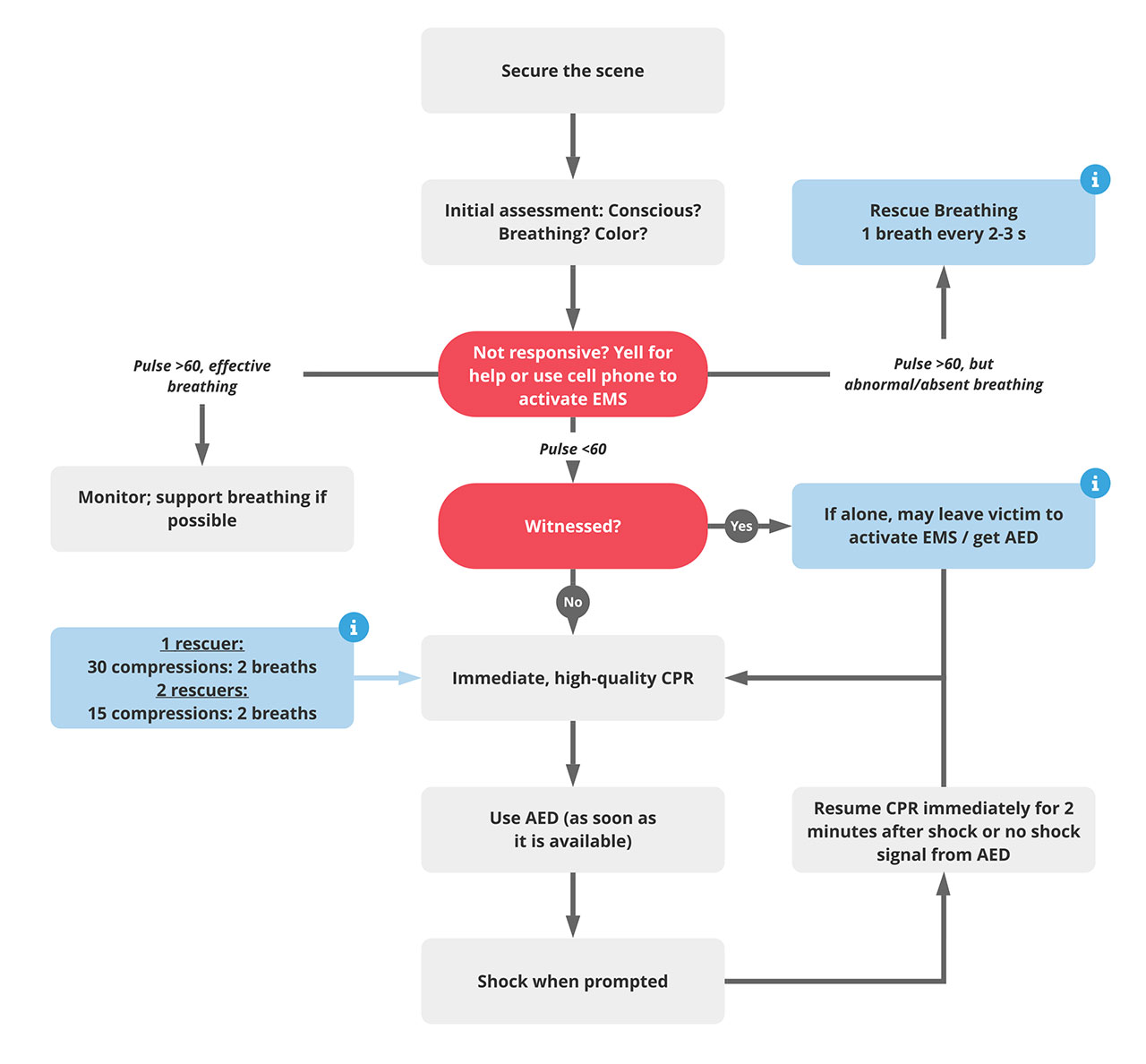 If there is a pulse and no/abnormal breathing, start rescue breathing (1 breath every 2-3 seconds).