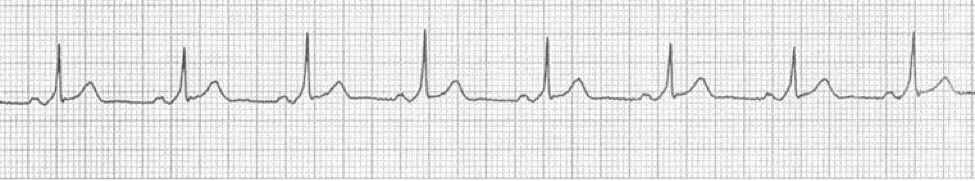 False. The ECG strip shows classic delta waves, indicative of a Wolff-Parkinson-White pattern. Wolff-Parkinson-White syndrome is a reentry tachycardia in which an accessory electrical pathway exists in the heart the changes the normal conduction pattern. The delta wave, which appears at the beginning of the QRS complex and usually looks like a “hump,” or triangle, reflects current traveling just a little bit faster through the heart (through the accessory pathway).